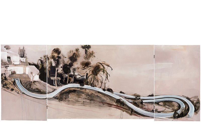 akryyli- ja kananmunatempera, sekä öljy ja alkydi kankaalla, osat: 215 x 130, 210 x 310, 215 x 130 cm
